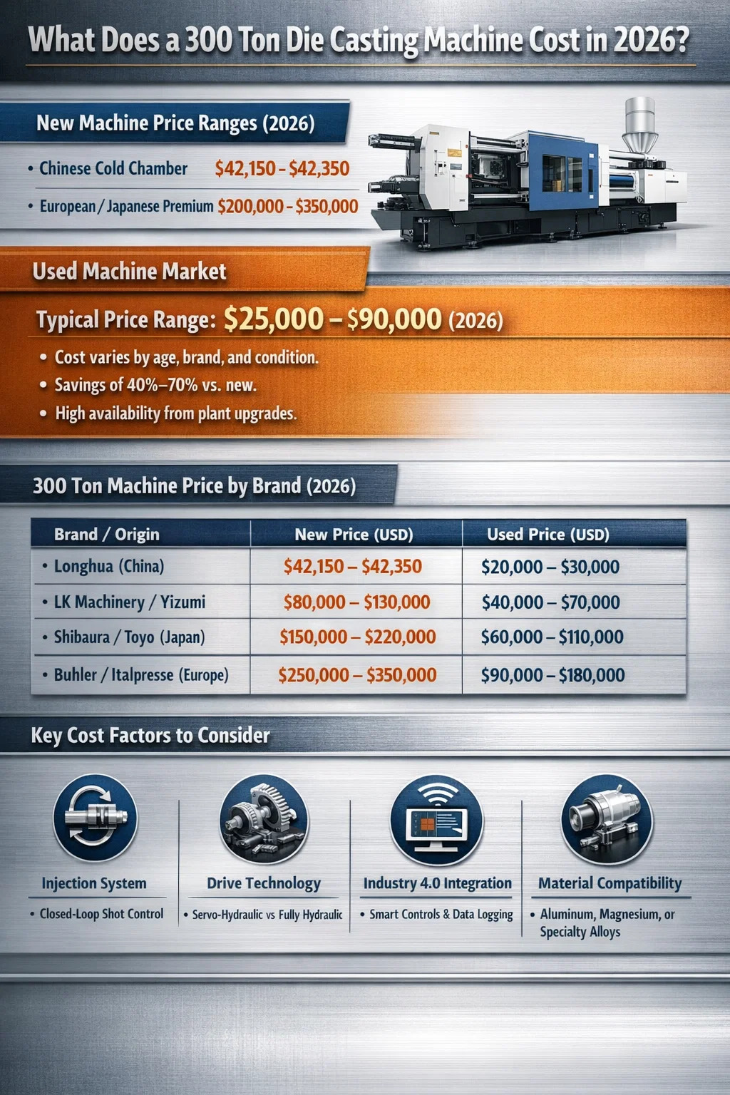 Table 1: Approximate 2026 market prices for 300 ton die casting machines by brand origin. Prices vary with configuration, peripherals, and import costs.