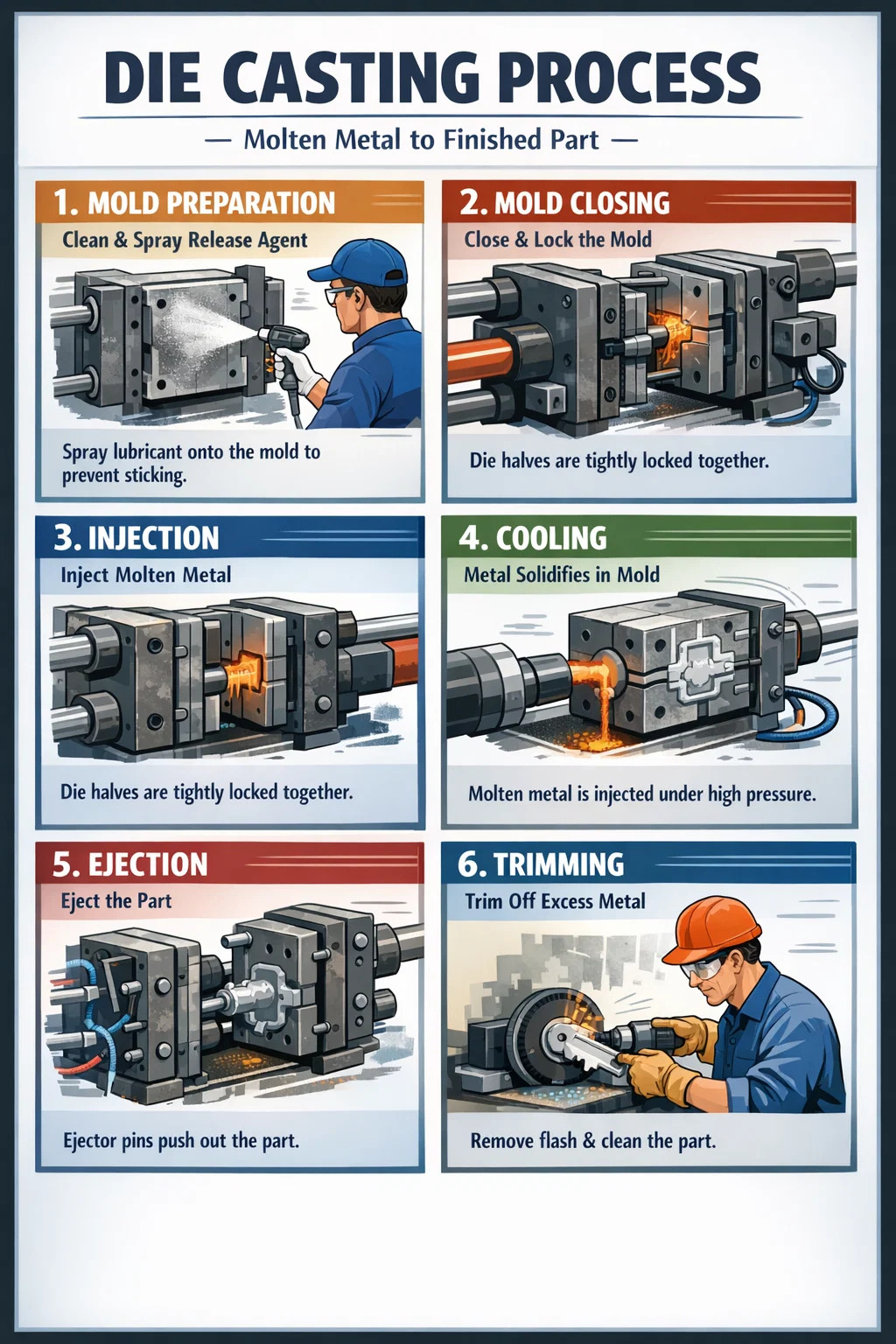 Kulcspont: Ezen a ponton a gép hatalmas erőt fejt ki a forma reteszelésére. Mivel a nyomás nagyon nagy, ha a forma nincs szorosan lezárva, akkor az olvadt fém kifröccsen a résekből, és az alkatrész tönkremegy.