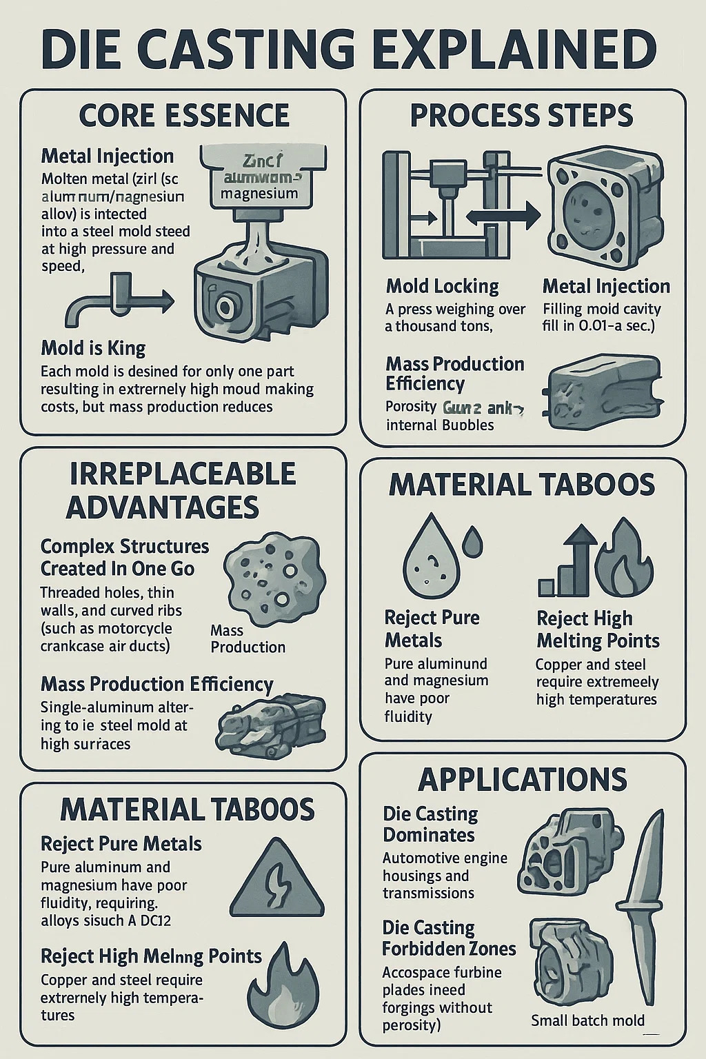 A tiszta fémek elutasítása: A tiszta alumínium és magnézium gyenge folyékony, és ötvözeteket igényel (például ADC12 alumínium 10% szilíciummal).