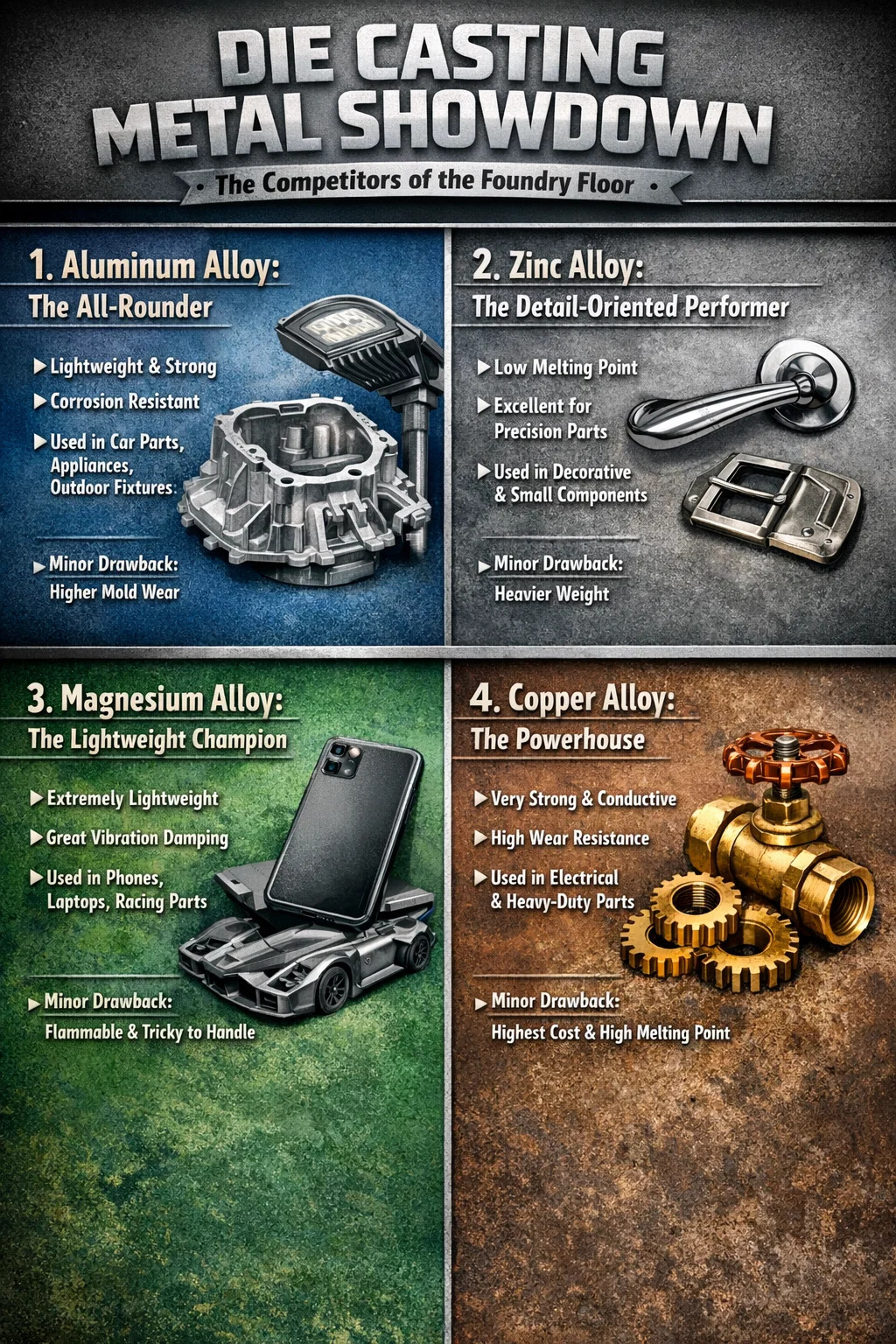 Amikor arról van szó, hogy melyik fém a legalkalmasabb fröccsöntés , nincs abszolút "első számú", mivel ez attól függ, mire szeretné használni. A gyárakban a három leggyakrabban használt fém az alumínium, a cink és a magnézium.